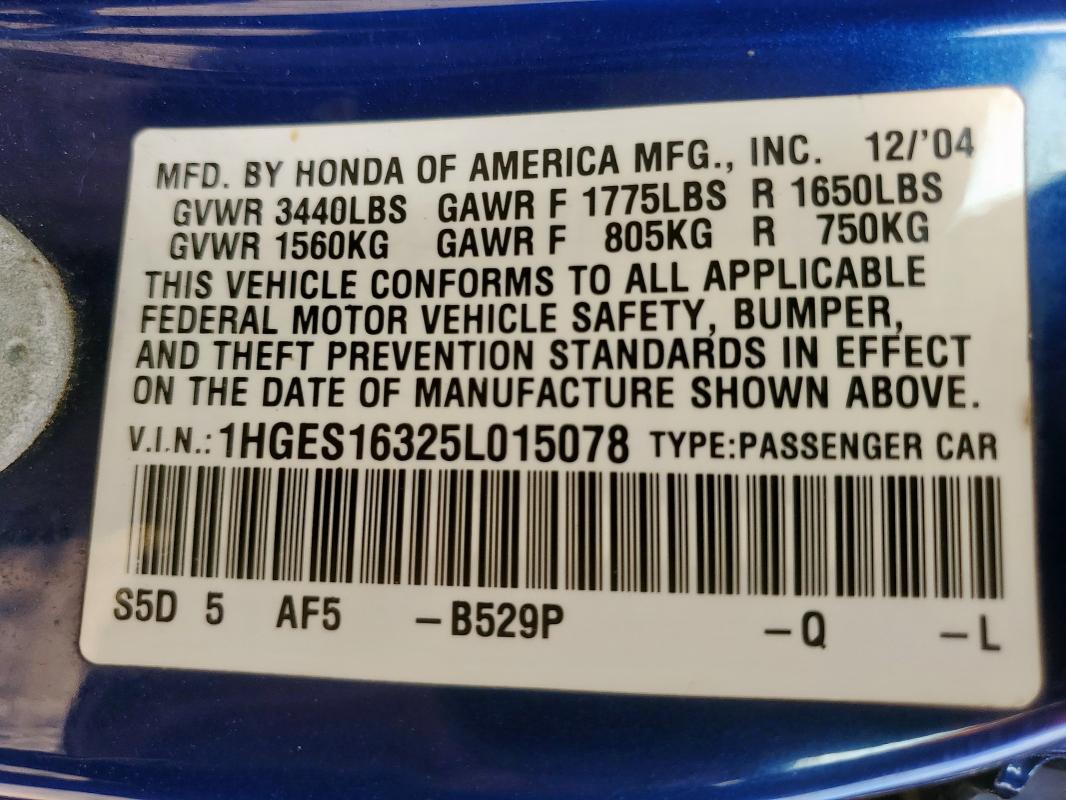 | VIN: | 1HGES16325L015078 |