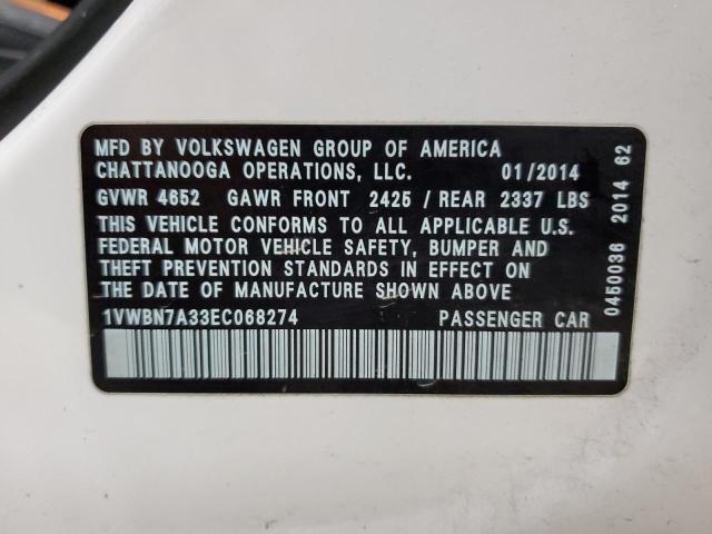 | VIN: | 1VWBN7A33EC068274 |