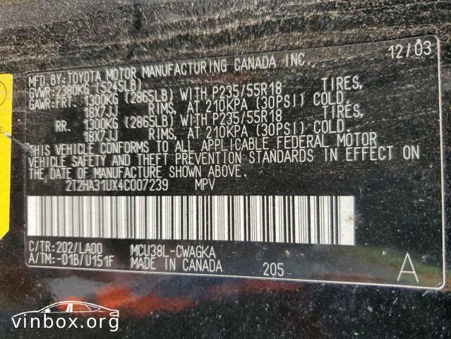 | VIN: | 2T2HA31UX4C007239 |
