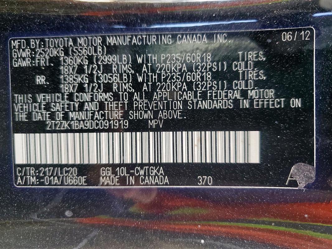 | VIN: | 2T2ZK1BA9DC091919 |