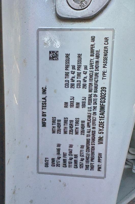 | VIN: | 5YJ3E1EA0MF030239 |